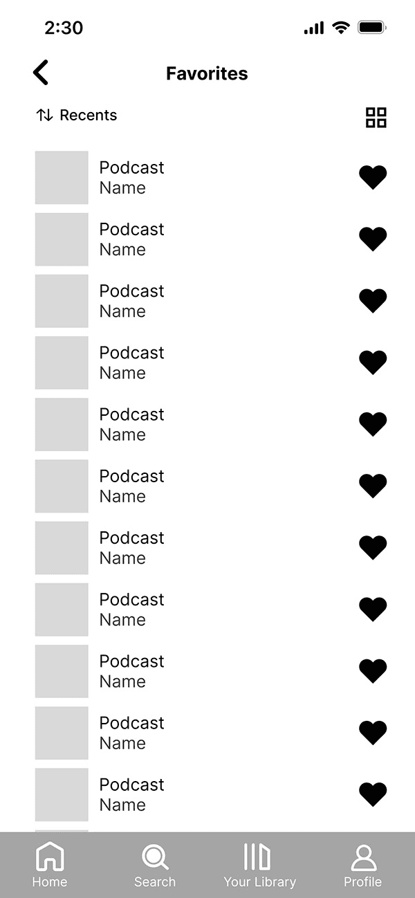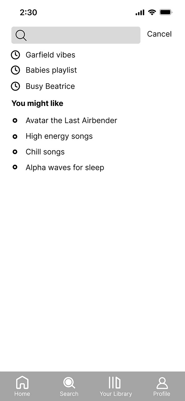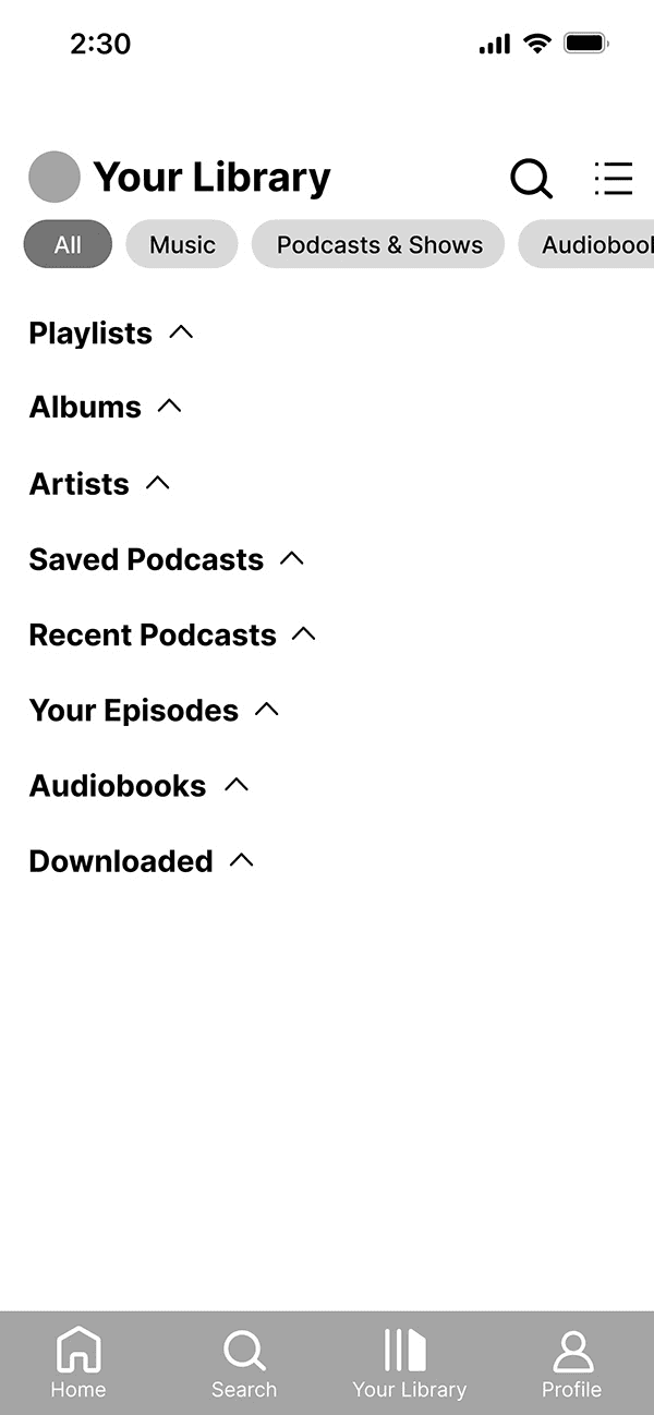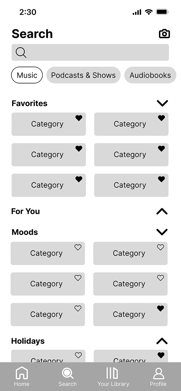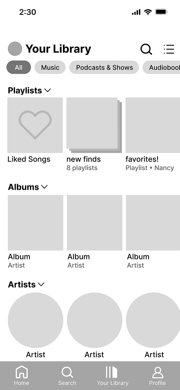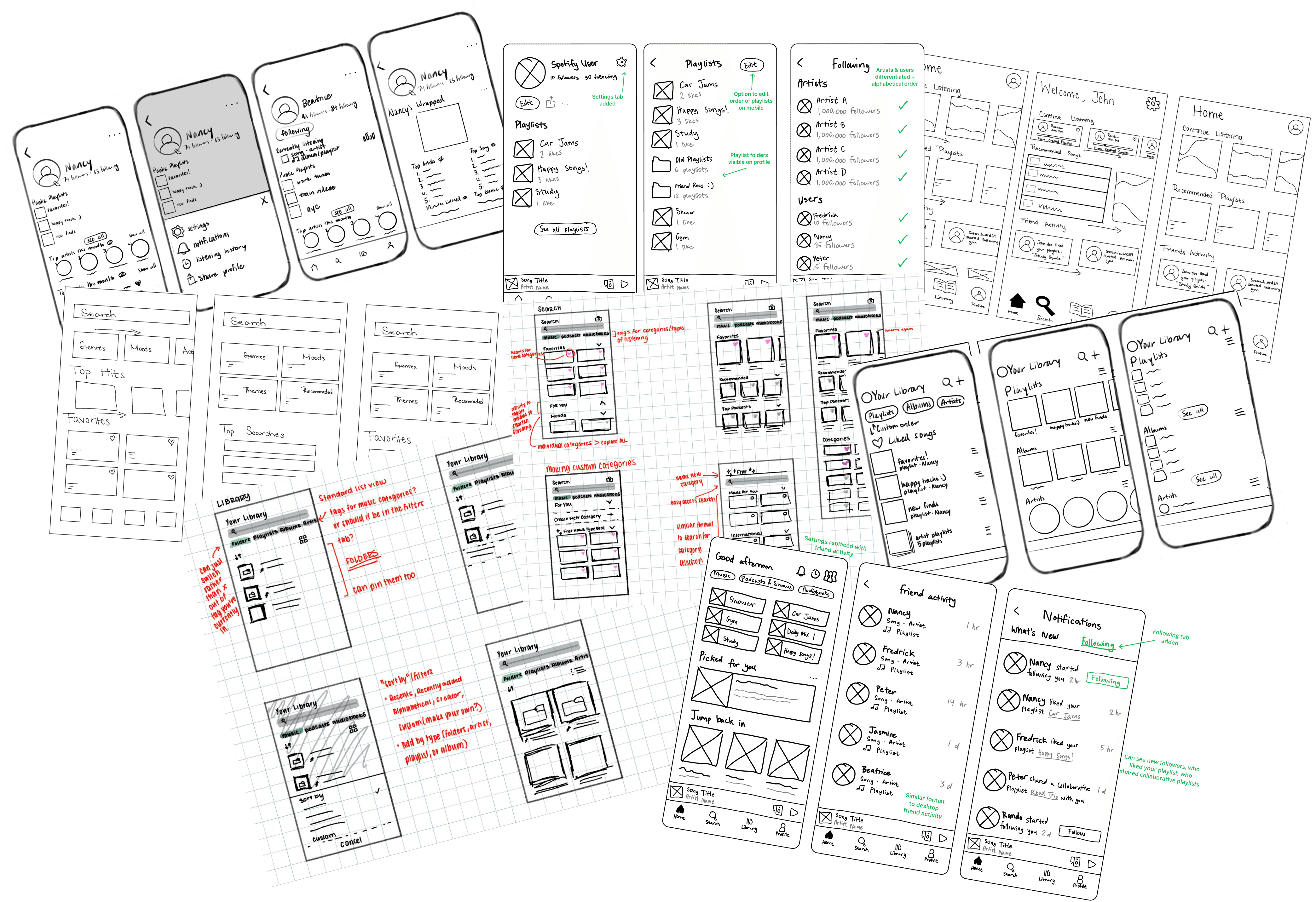 We started with rough sketches to communicate our initial ideas for the redesign. Each of us took two of Spotify's four main areas—home, search, library, and profile—and combined our ideas to determine which new features we should carry into mid-fis.