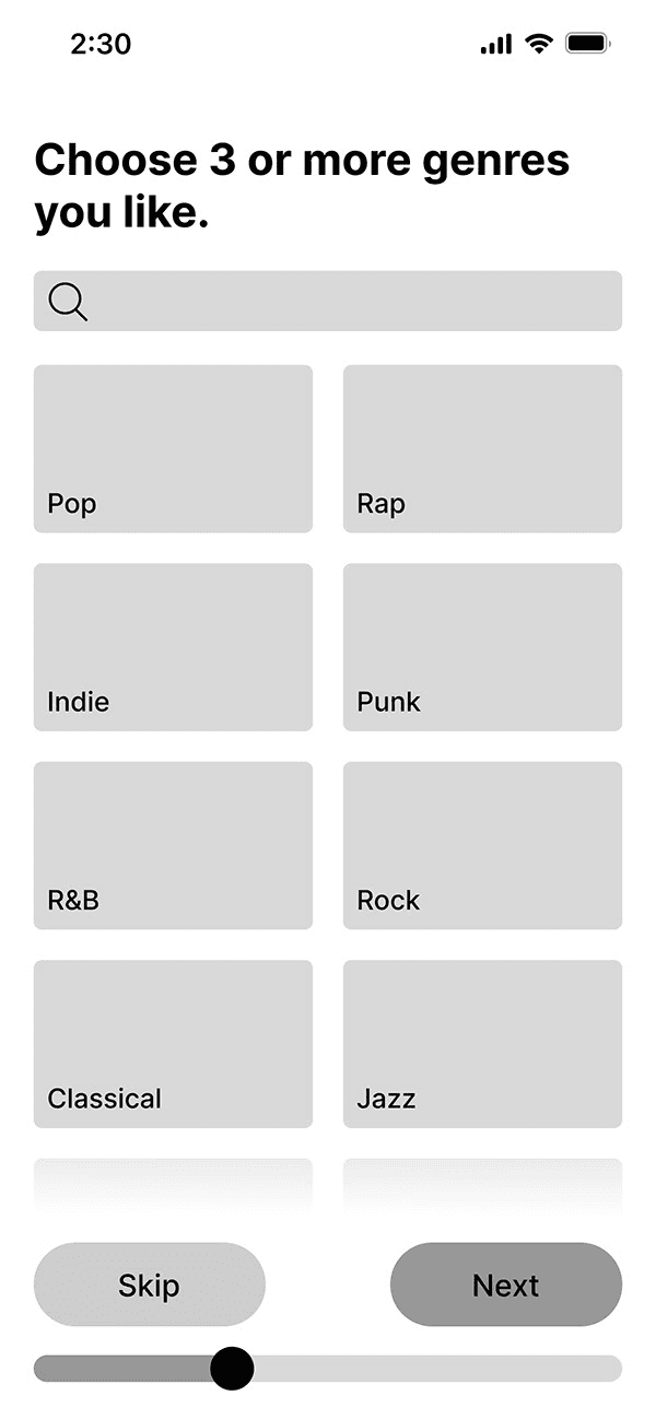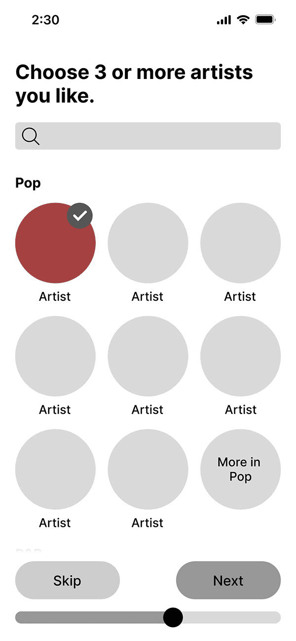 Once a genre is clicked, users can see albums and songs they've liked in that genre. Since we found that users typically go to their own music over recommendations, we placed them above recommendations.