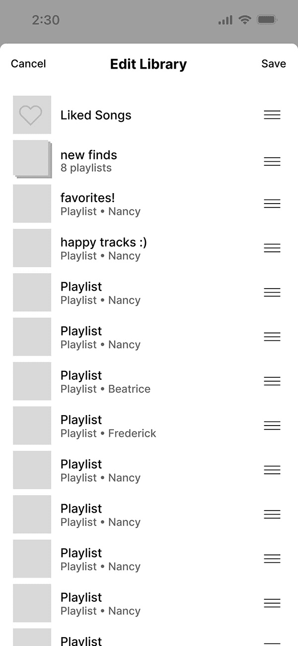 We added an edit menu to reorder content in the library, yet another feature missing on the Spotify mobile version. Users can easily personalize their library and push favorites to the top.