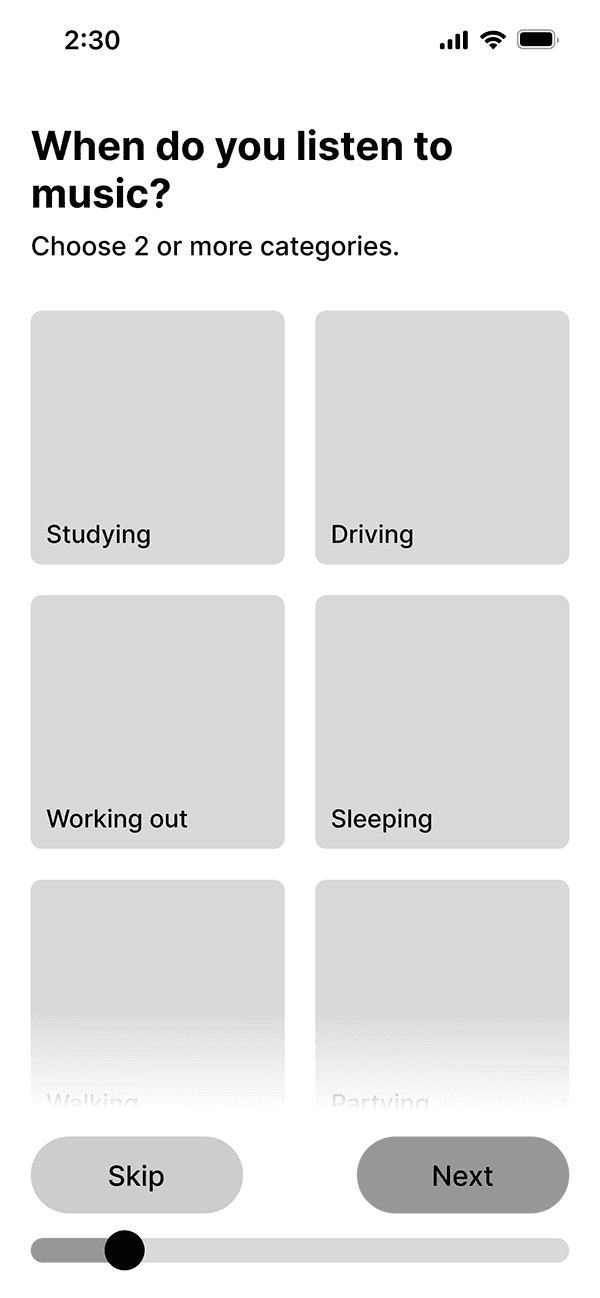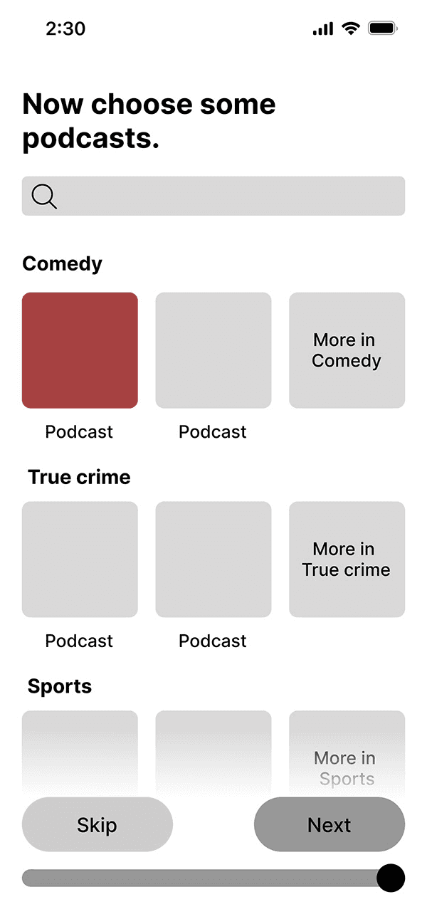 If users feel that onboarding is slow or unnecessary, they can skip any part. If they aren't interested in podcasts, the podcasts section can be skipped altogether.