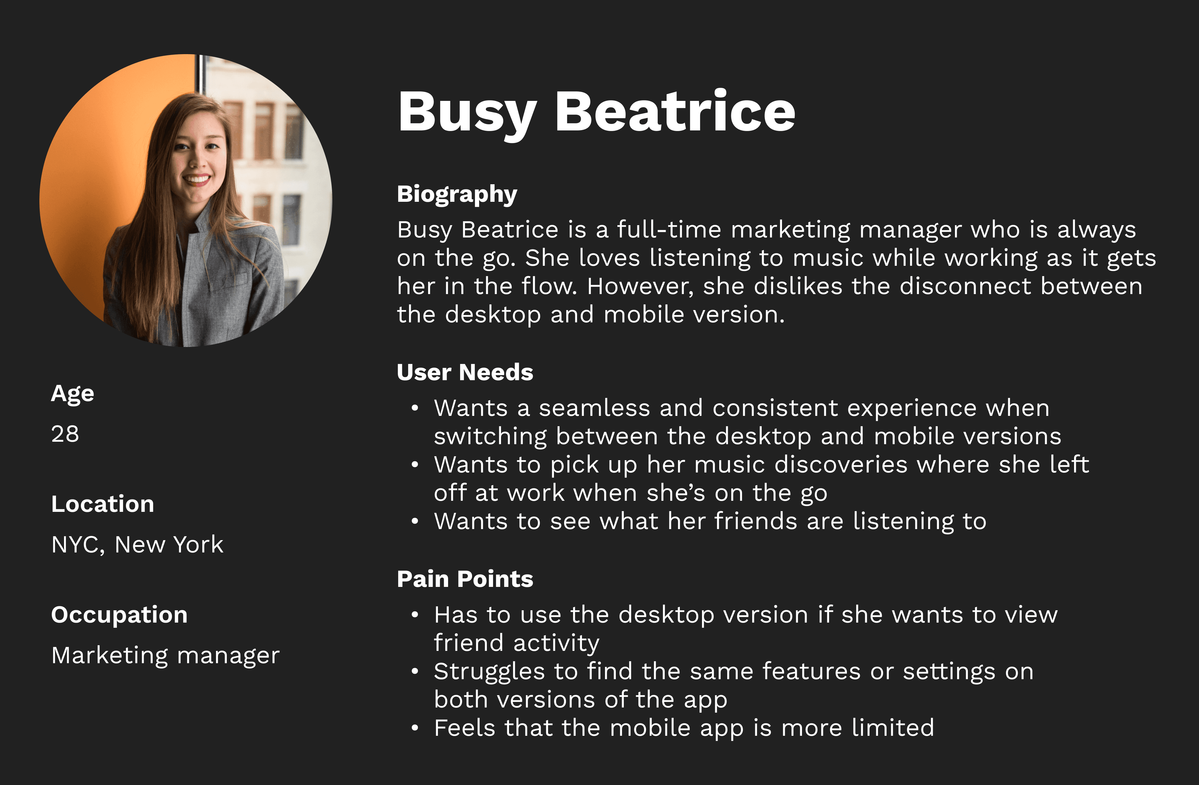 Our persona “Niche Nancy" reflects users who have issues with Spotify's recommendations and how the app is organized.