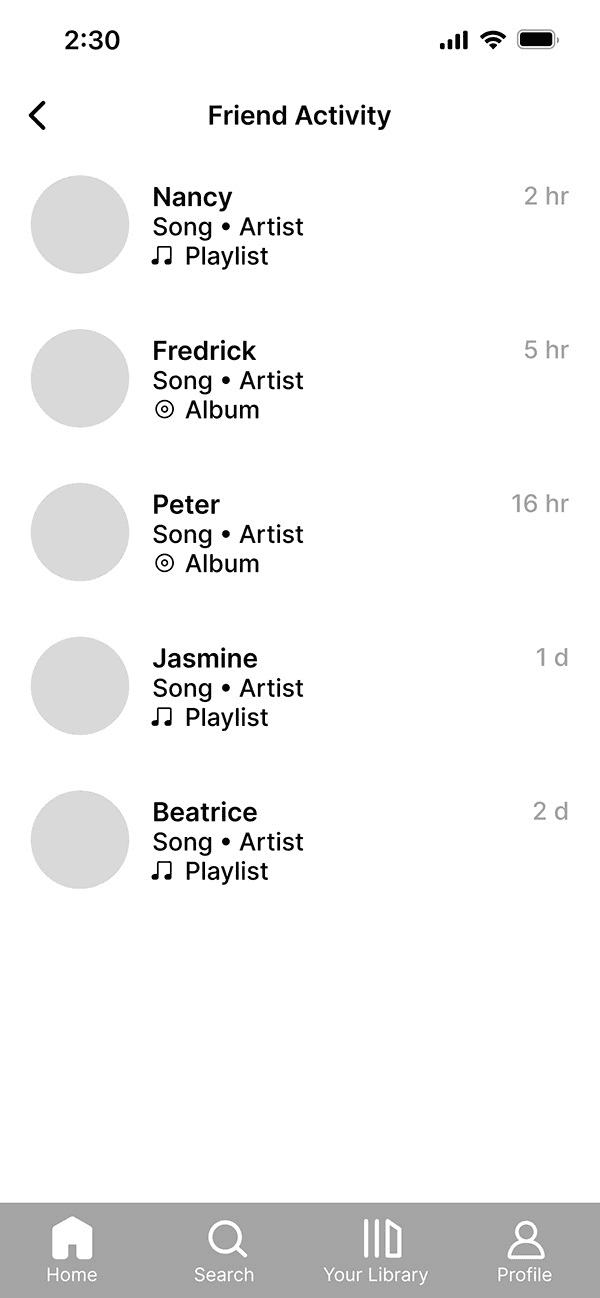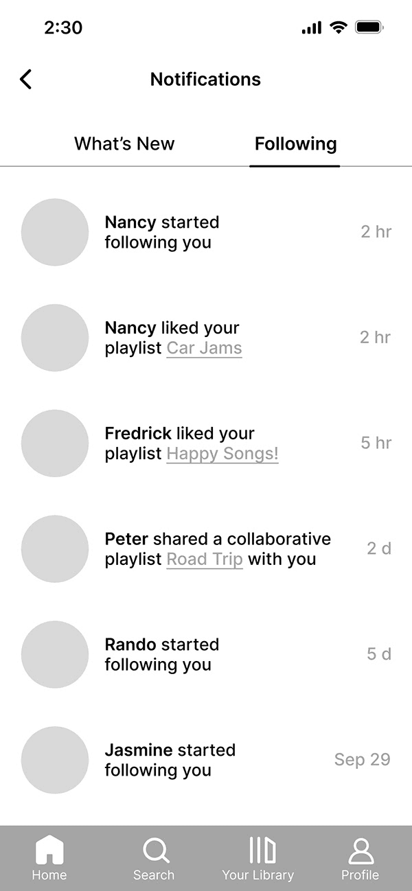 We added a following tab where users can see notifications such as new followers, likes on their playlists, and collaborative playlist invitations. A friend activity tab was also created for users to see what their friends are listening to, formatted consistently with the desktop version.