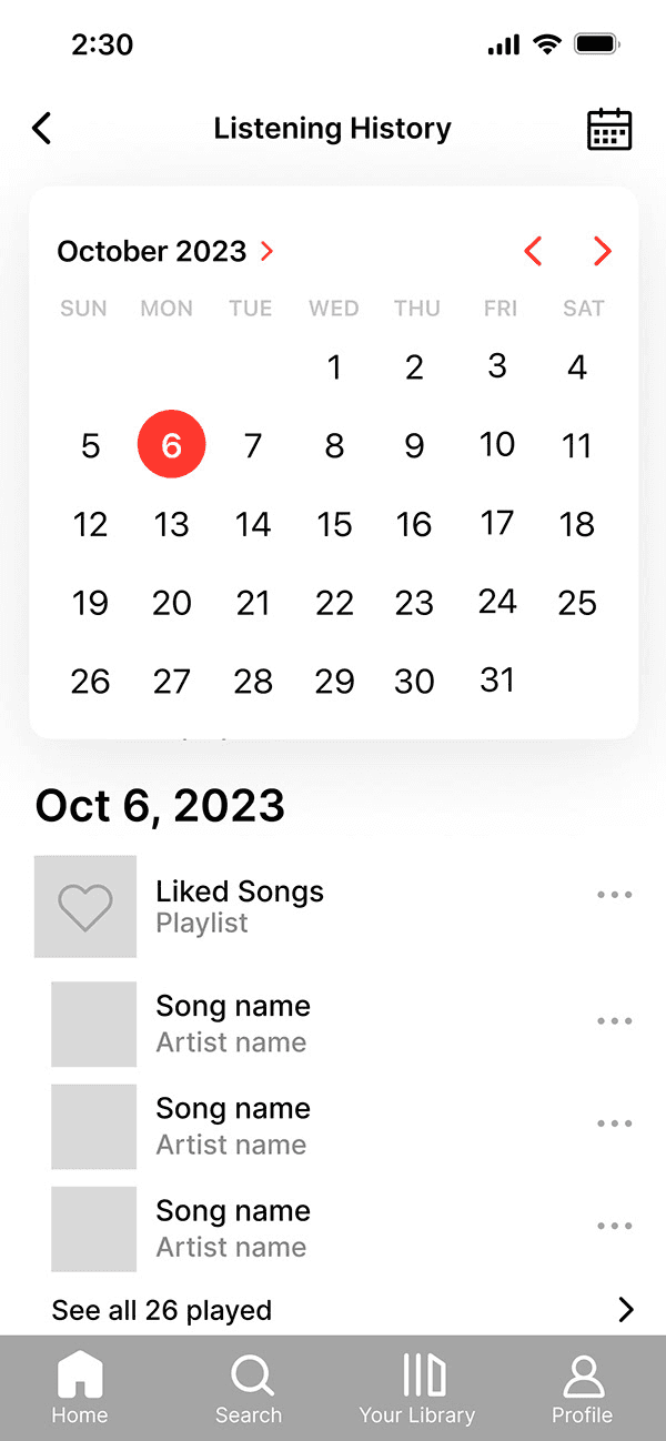 To reduce vertical scrolling, listening history is condensed to three songs per day and a "see all" option. We also implemented a calendar for users to easily jump to a specific date instead of spending time searching.