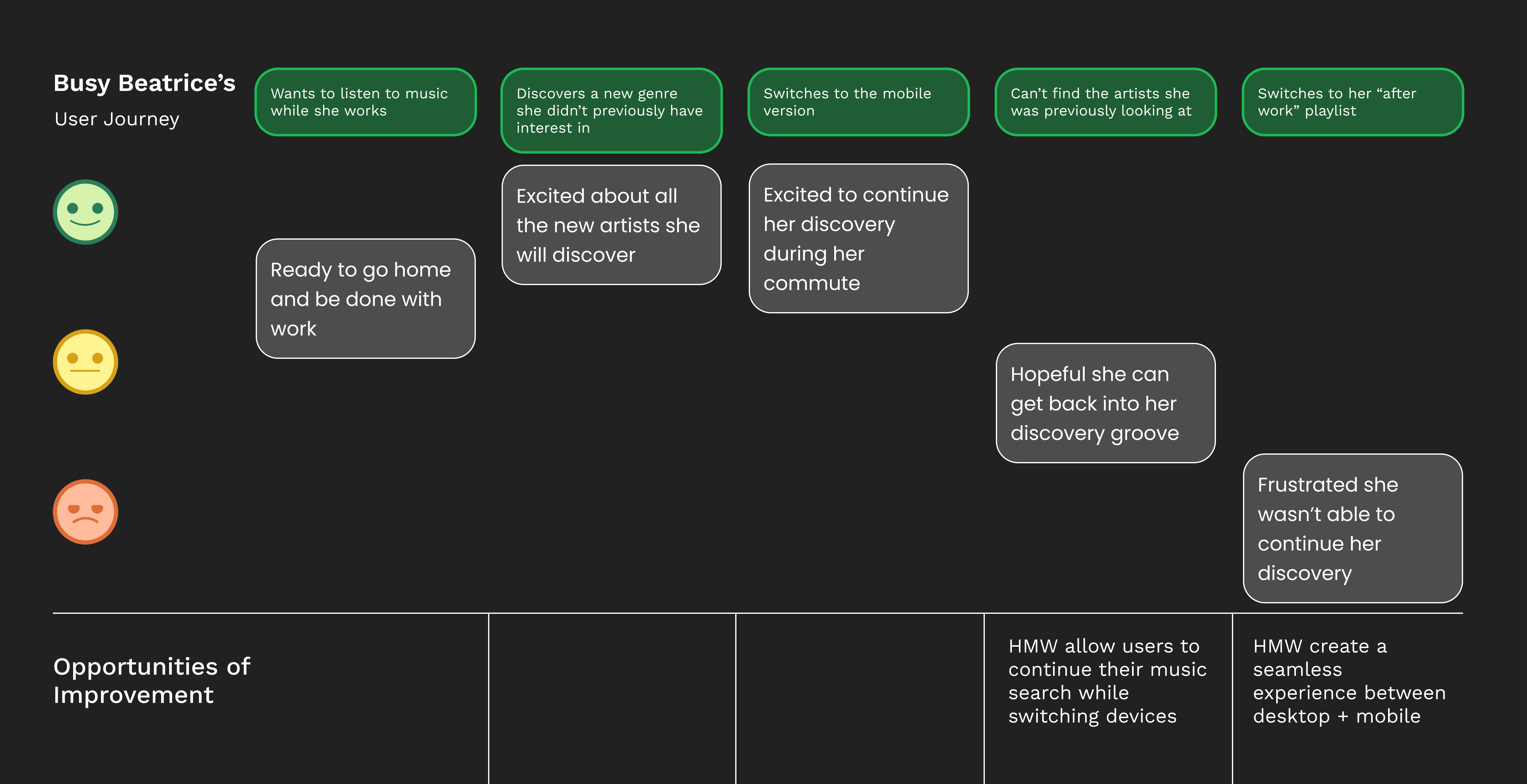 Using the insights derived from our interviews and competitive analysis, we created user personas that reflected real Spotify listeners' needs and pain points. We also outlined journey maps that these users would follow, leading to “how might we" questions that arose at different stages of their experiences.